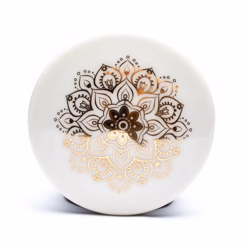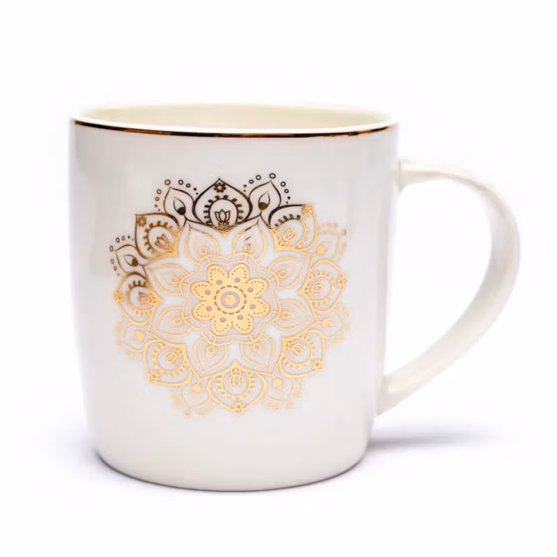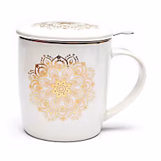 Temugg med lock och infusionsenhet i rostfritt stål, med mandaladesign.