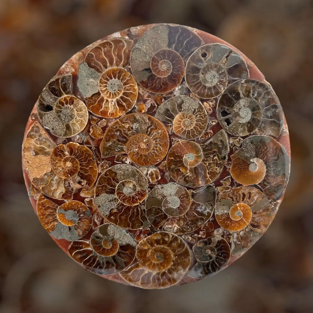 Denna fascinerande Ammonitplatta är en hyllning till jordens uråldriga skönhet och naturens underverk.