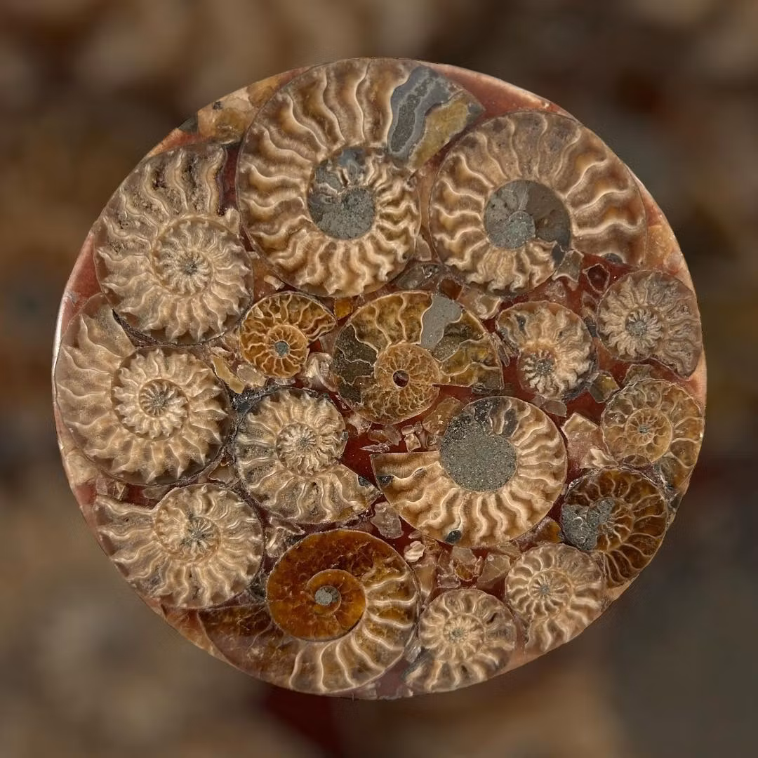 Denna fascinerande Ammonitplatta är en hyllning till jordens uråldriga skönhet och naturens underverk.