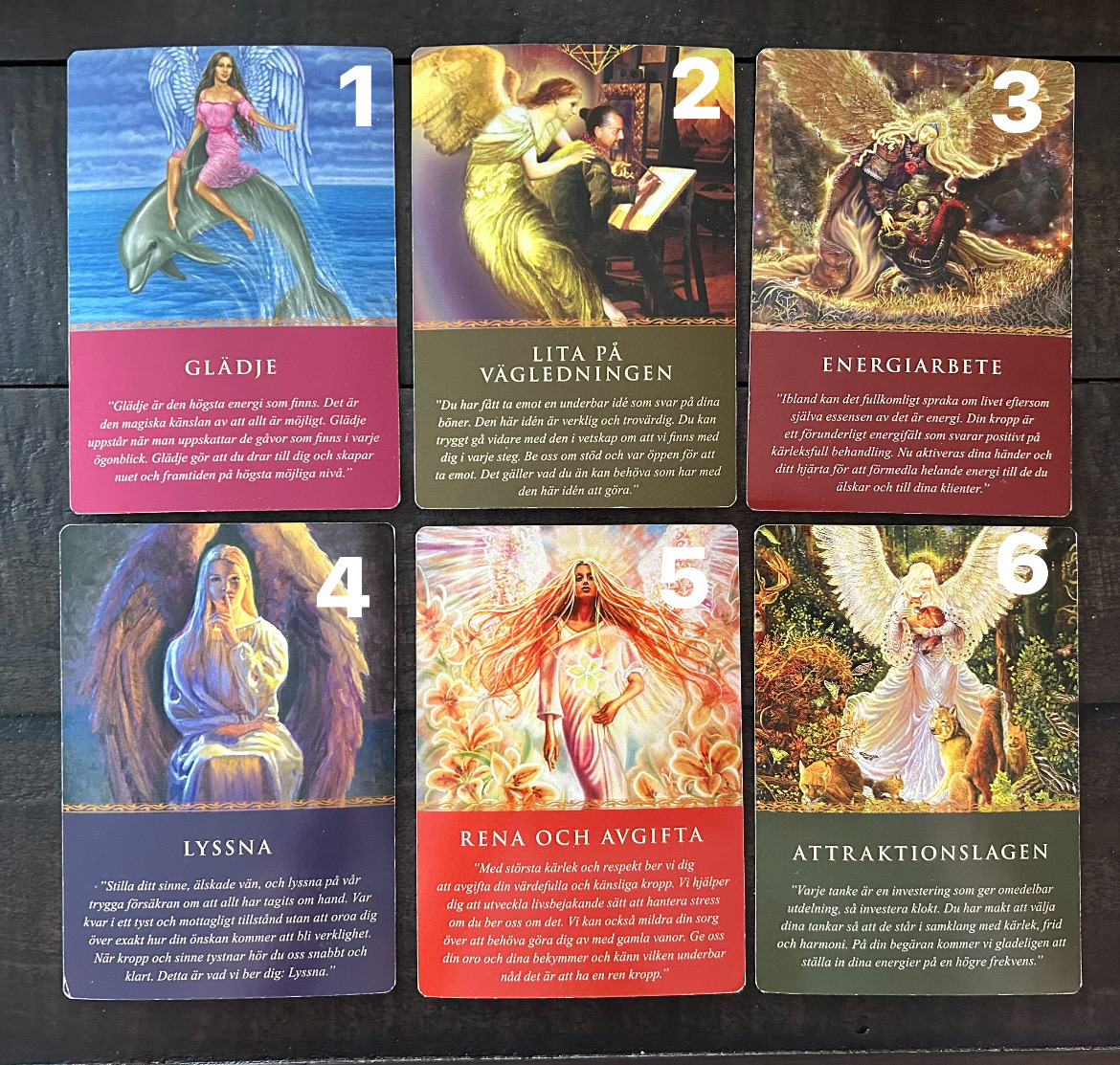 Änglarna gav dig det här kortet därför att de vill att du ska tro på dina idéer. De är bönesvar och du kan lita på dem. Vi stöttar dig hela vägen när du sätter dina ideér i verket. Se till att du kontaktar änglarna ofta för att få kontinuerlig vägledning. Om du känner dig sårbar någon gång, be dina änglar att trösta och lugna dig genom känslomässig, andlig och materiellt stöd.