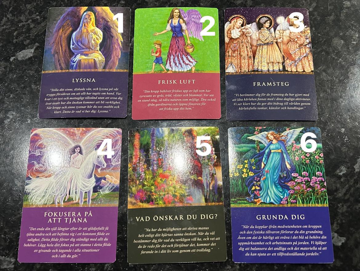 Du fick det här kortet därför att änglarna vill att deras budskap ska nå fram till dig. De ber dig att tala mindre och lyssna mer. (När man är stressad blir man lätt pratsam.) Ge dina bekymmer till änglarna och lita på att de har hört dina böner. Om det verkar som om de inte svarar inte på dina böner, så är det troligen för att du inte lyssnar på svaren. Dra dig alltså tillbaka till ett lugnt ställe för att lyssna på dina änglar. Blunda, andas djupt……och lyssna.