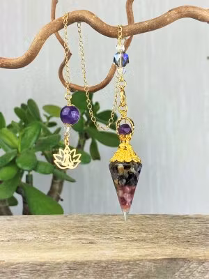Vacker orgonit pendel med lotussymbol. Pendel med Turmalin, Bergkristall och Ametist.