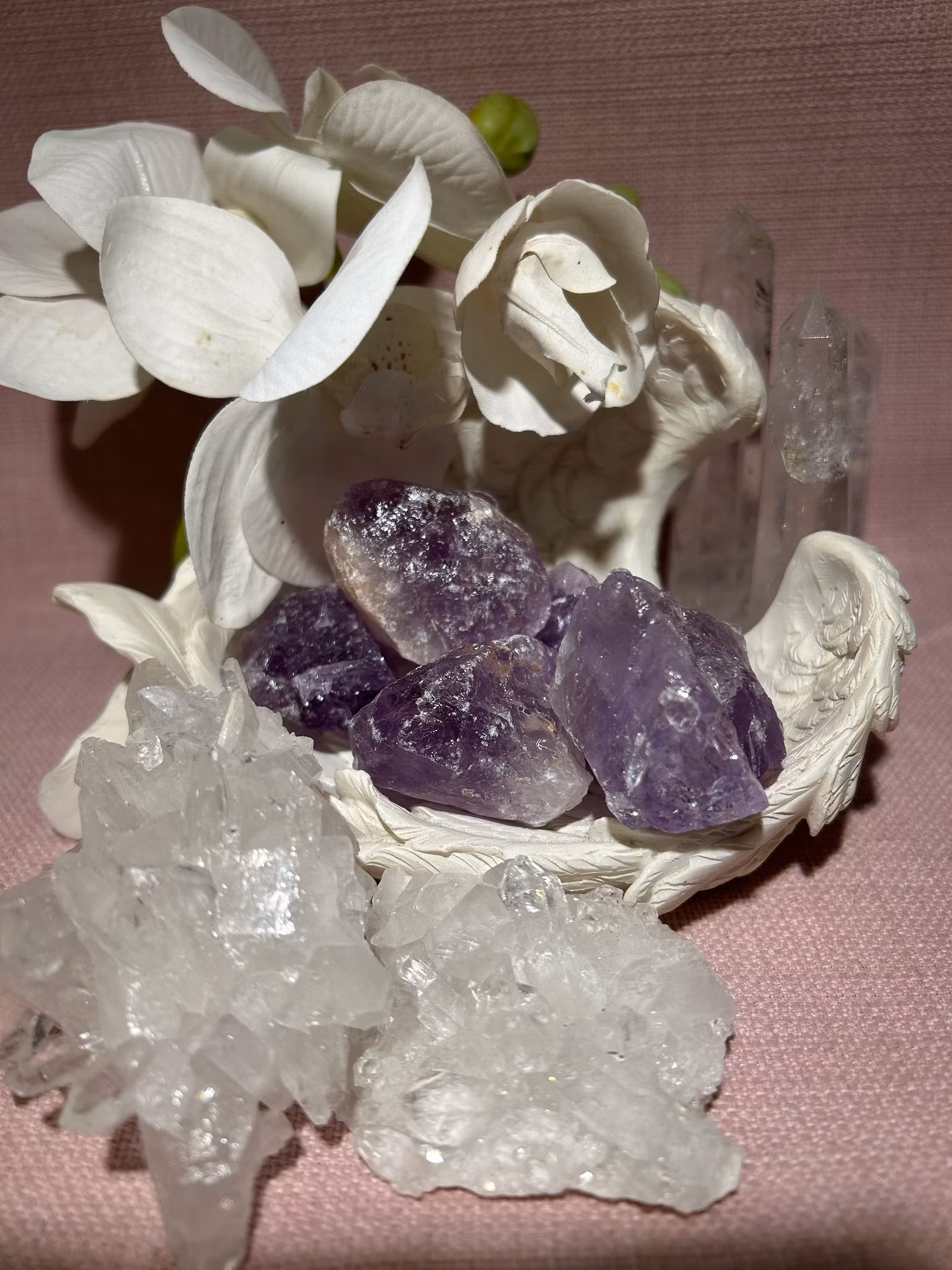 Ametist är en högt andlig sten, verkar direkt genom kron chkarat. Den har en stark healing energi, är lugnande och rogivande. En naturlig stressborttagare. Den stärker ditt andliga jag, och bistår dig i din andliga utveckling.
