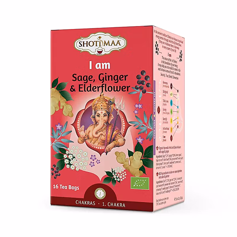 Ayurvediskt ekologiskt krydd- och ört te av salvia, ingefära och fläder som hjälper till att balansera rotchakrat. Tillåt energin att flöda fritt genom hela din kropp.