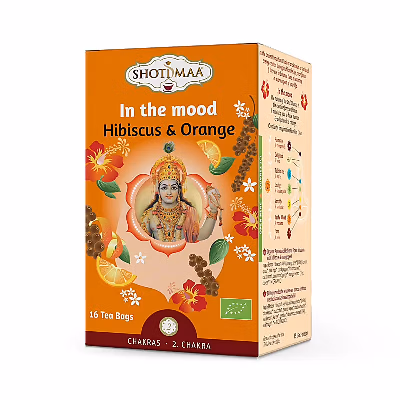 Ayurvediskt ekologiskt krydd- och ört te med smak av hibiskus & uppfriskande apelsin som hjälper till att balansera sakralchakrat.